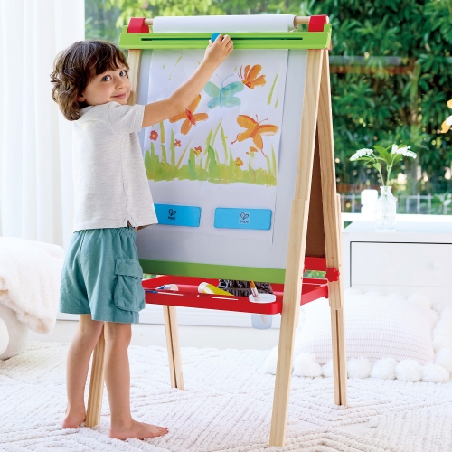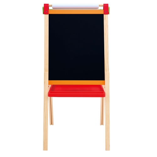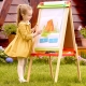 Этот игровой мольберт имеет двухстороннюю конструкцию. С одной стороны — белая маркерная доска, с другой — магнитная черная доска для рисования мелом.\n• Регулировка высоты — четыре уровня высоты от 90 до 115 см позволяют адаптироваться под рост ребенка.\n• Комплектация: мольберт, рулон бумаги длиной 5 метров, 2 пластиковых стакана, моющийся лоток, 2 магнита для бумаги, чистящая салфетка, 2 маркера, 2 мелка, 2 кисти, 3 тюбика краски по 30 мл, подставка для красок.\n• Материалы: дерево (сосна, МДФ), пластик (ABS, полипропилен, нейлон), сталь, бумага.\n• Размер мольберта: 52 х 43 х 115 см.\n• Возрастные рекомендации: 3+